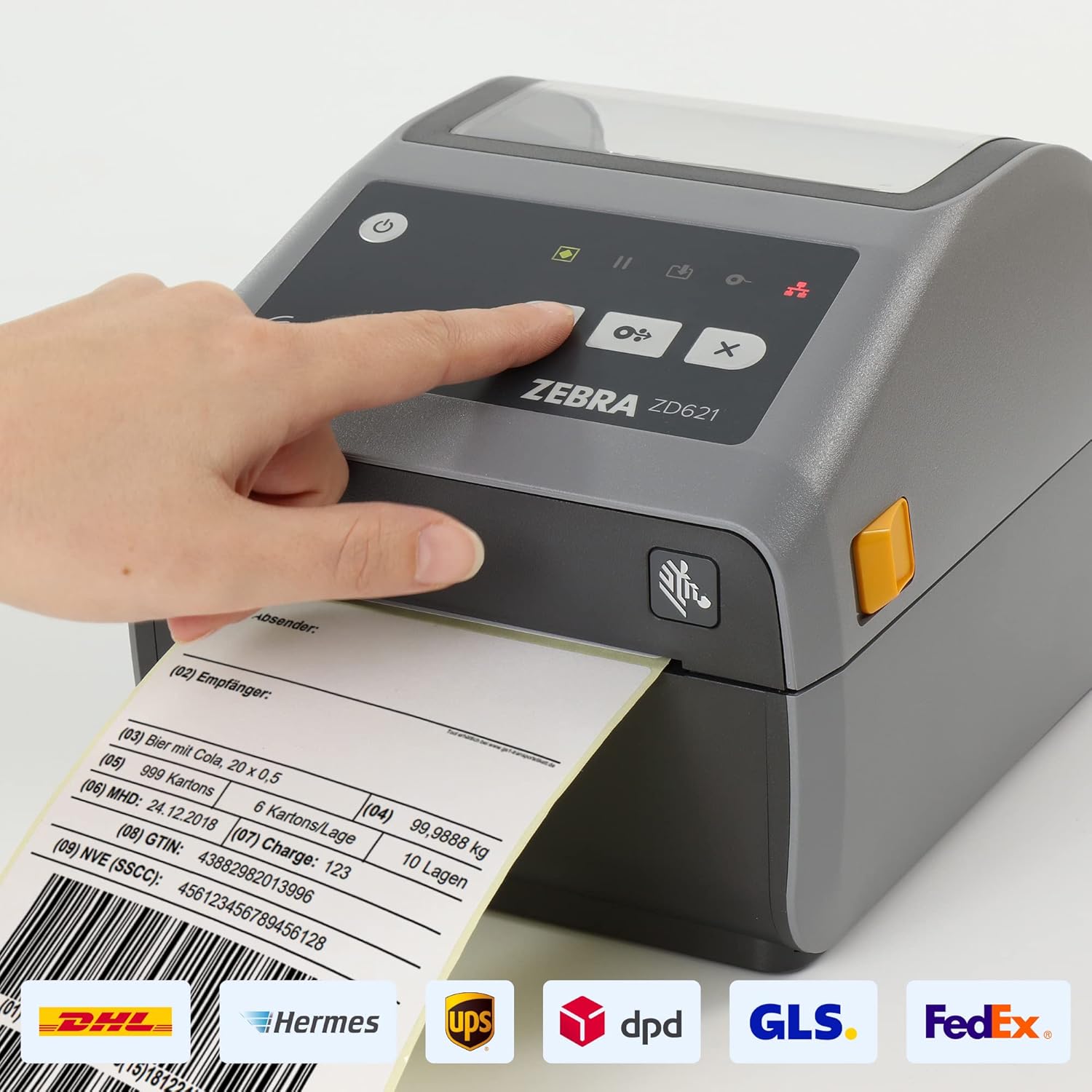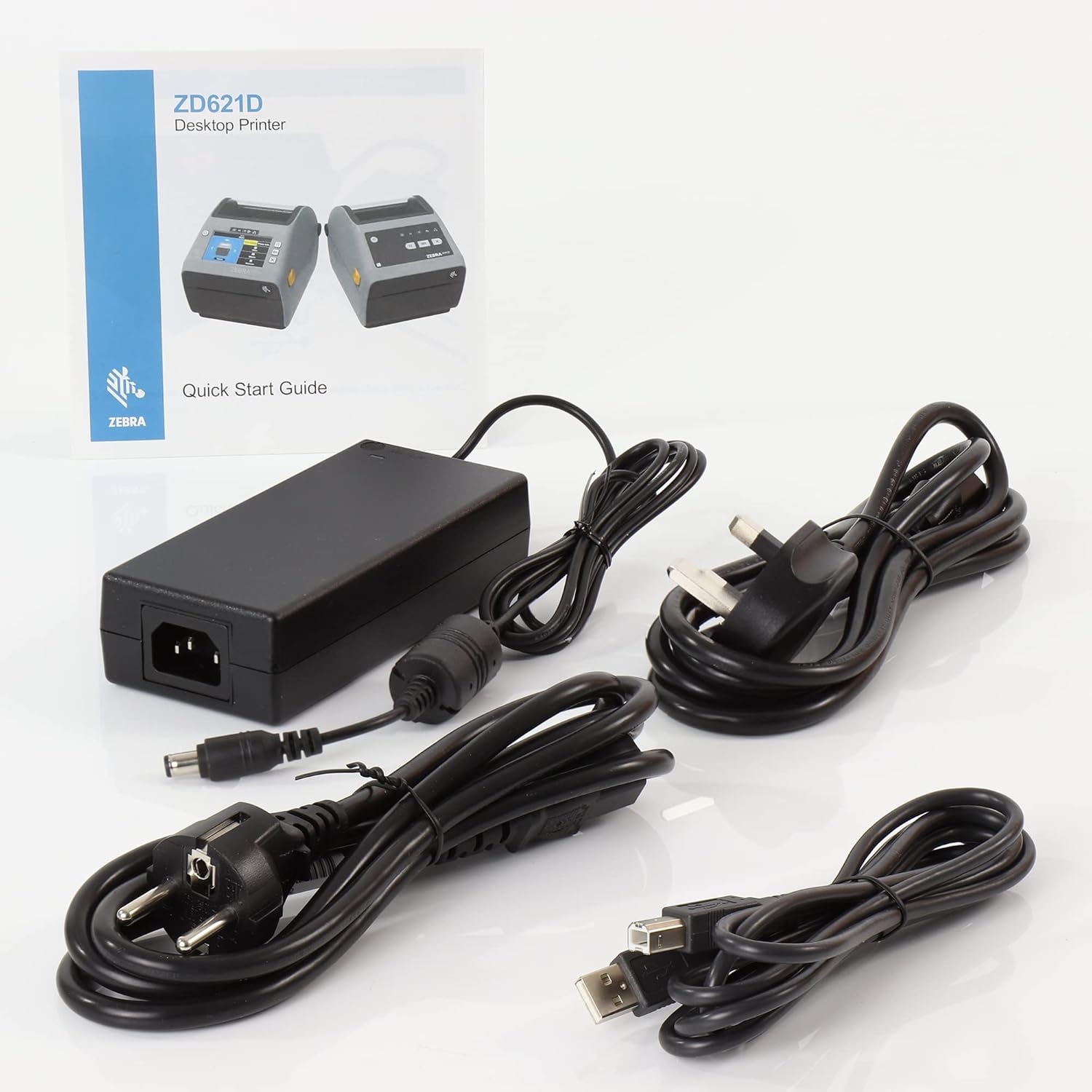 Zebra ZD621d, USB-Kabel, Netzteil, Netzkabel (EU/UK), 2 Kernadapter, 2 Bandkerne |